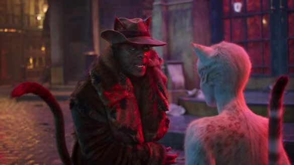 As a result of waiting a few weeks after release, I can report that when I saw it the FX were mostly fine. There were no “hilarious” goofs, nor the joys/distractions of Cronenbergian body horror. It was a troop of dancers prancing around in what looked like CGI catsuits. If you’ve seen pictures of the stage show it’s pretty much the same as that, including a number of impressive busts on the women and generally nondescript crotches for all. There’s a slight touch more of uncanny valley when the visuals almost work too much, but overall the effect works in making you go “that’s a person in an impressive costume”. Some of them are very impressive costumes, especially Judy Dench’s, but even with the tails, and occasionally the ears, being used to convey cat emotions and behavior it never goes beyond that. It gets worse when movie magic is employed to enhance the performers’ movements because all the jumps and climbs that a human couldn’t do just end up looking like dodgy 90s wire-fu.