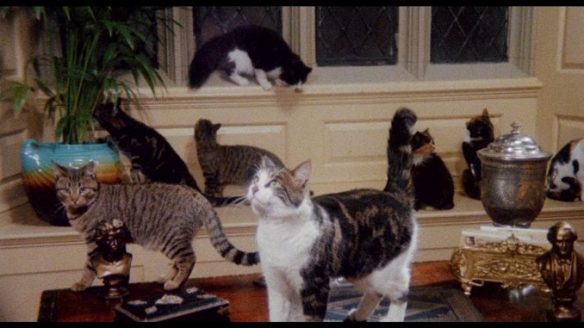 Finally, it’s Hollywood 1936, in a sequence starring Donald Pleasence being an utterly vile leading man and an absolutely adorable basket of kittens that he flushes down the loo. Whilst this is arguably the hammiest of the three stories, it’s also the most fun as Pleasence plays everything at 11 and the subtle gags are flung around in between the low budget violence. It’s more in-keeping with the first story than the second, making Lucy’s tale feel even more uneven, and is a solid example of “the best ‘til last” in all aspects. Well, that’s until the end of the framing story, and Peter Cushing being silenced by the league of sinister cats…