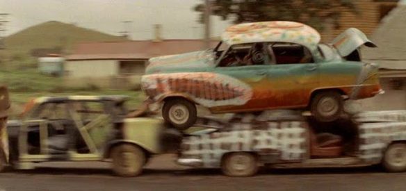 Whilst heading towards the town of Paris, somewhere in the farmland outback, the two brothers are involved in a car accident. Arthur lives and finds himself taken under the wing of the outwardly respectable, but utterly creepy, Mayor Len Kelly (John Meillon). From there, he and the audience get introduced to the locals, who blend middle-of-the-road respectability with outlandish freakishness by all being molded by the town’s one economic product: making cars crash and then taking whatever they can find from the vehicles. Everything is bought by bartering of victims’ items, the Mayor’s kids were “adopted” from such forced accidents, and the local doctor is getting a steady supply of subjects for his experimental brain surgery. The whole town is in on the slaughter, but no one says anything because that’s just not The Done Thing. For the youth of the town (which includes Bruce Spence doing his amazing trademark job as a local weirdo), this means driving around in homemade murder buggies, expressing teenage rebellion by bringing to the surface what their elders are trying to obfuscate and repress.