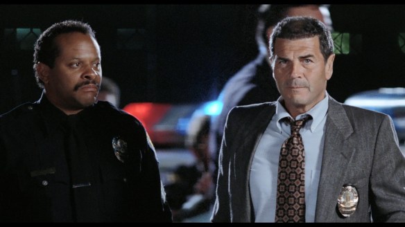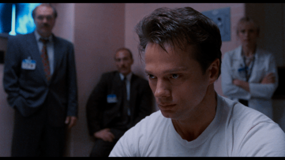 On top of this, there is the fact that Sam is a police officer, and the entire plan to keep his scanner status is to not tell anyone. Other than his police doctor, his Sargent, the Lieutenant, or anyone in earshot whilst they’re talking loudly about scanner things. There’s also anyone on the force, or in its general facility, who can put two-and-two together about scanners existing in large numbers and this particular officer always catching lucky breaks, having 100% correct gut feelings about things, and being able to get all the information needed to break the case by looking at a suspect in a squinty manner. Given that the anti-scanner drug is available next to the aspirin, going “I think that cop is a scanner” wouldn’t be wild conspiracy talk. Additionally, if a medical condition is common enough for a GP to be disinterested by it then there will be lawyers out and about to make money off it. Is scanning a violation of a criminal’s rights? Can Sam’s evidence stand up in court? Does a post-scan nose bleed count as police brutality? Inquiring checkbooks want to know! However, this film doesn’t care less and leaves everything in a contradictory state of inconsistency, which makes it impossible to know what the stakes are.