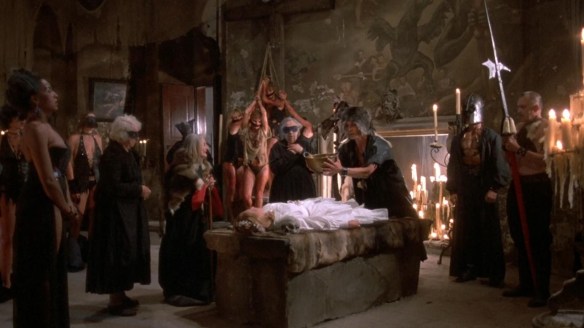 Next stop: The Dark Country, Transylvania (well, actually Czechoslovakia). You can tell it’s a bad place because everyone is foreign and talks in bad accents. Here we get introduced to Stirba (Sybil Danning), who is absolutely not a vampire even if she regains her youth from sucking a sacrificial virgins lifeforce, and her boobs. She’s the leader of the werewolves (“Queen Bitch”, if you will) and she’s going to bring about the rise of the werewolves through some something or something. The werewolves appear to be really into Latin heavy rituals, lots of exciting black leather underwear, blood sacrifices, and living in castles. But, again, to be clear, not vampires. Even if there is a bat motiff going on in the background.