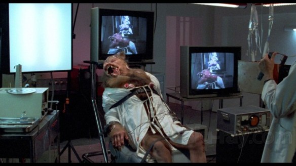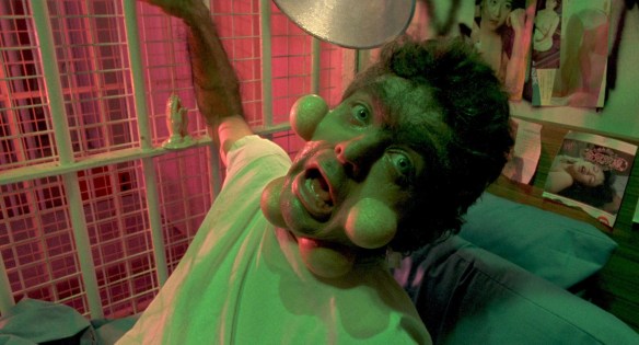 A more subtle change is that this film is absolutely willing to get weird at the drop of a hat, and is more interested in trying to shove its gallon of ideas it’s 94-minute pint-glass of a run time. Things move blindingly fast and it assumes you have the intelligence to keep up and work some bits out for yourself, so don’t expect this to be a casual watch. It’s also very willing to take the piss out of werewolf movies as a whole, including The Howling series, which is a bold move. How sensible a choice that was is up to you as a viewer, especially as it’s movie-in-a-movie parody cinema-werewolf make-up isn’t that much of a step down from the special effects the actual werewolves have on display.