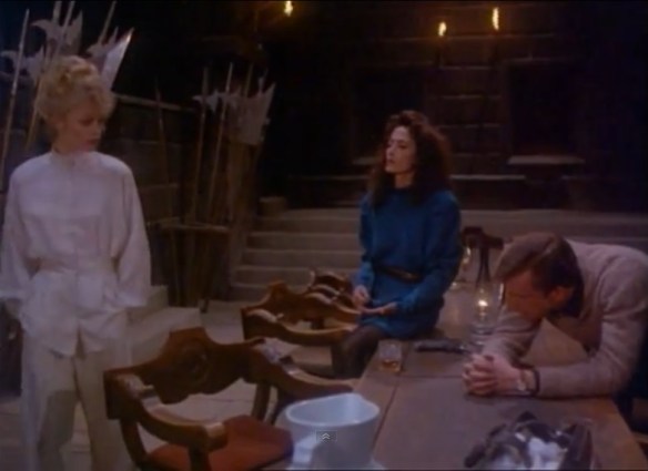 The other problem is the “It’s the Howling, so there must be nudity” moments. Well, half of them. The first, between the “will they, won’t they” pair of Marylou (Elizabeth Shé) and David (Ben Cole) is perfectly fine and relatively equal opportunities. The other scene is Anna (Mary Stavin) getting out of a shower and wandering around with an open towel, even though we’ve established it’s pretty cold in the castle. Here the camera is hyper-focused on her boobs, to such exclusion that it’s like the rest of her body is extraneous, and that’s just disconcerting to the point of making it a deeply unsexy bit of sexploitation. Boobs need the context of the rest of the body, is what I’m saying. Oggling them as their own, separated thing is just creepy.