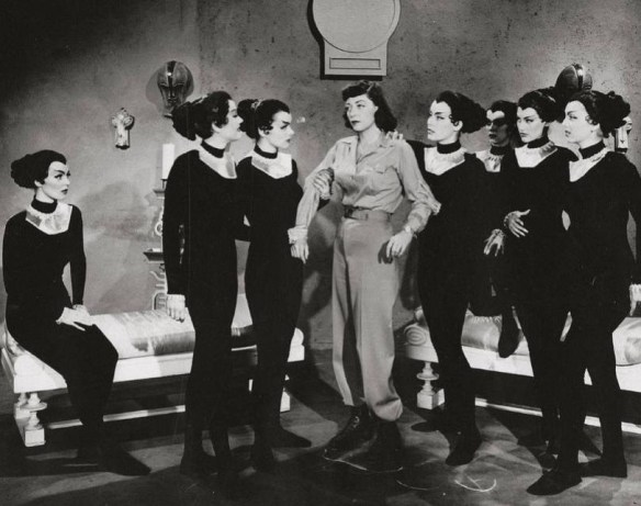So, for people taking notes at the back, here is the original “astronauts discover decadent, all-female (or almost all-female) civilizations on other planets” (according to The Encyclopedia of Science Fiction). It’s a 1953 release that was shot in black-and-white and released in 3D, because the cycle of getting people to watch any old rot by bunging on a gimmick was strong back then and 3D is a trend that just won’t die (no matter how many times it shoots itself in the face). And, oh boy, is this a lesson in how things were different back then.