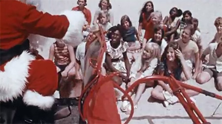 Santa then does the most obvious thing possible: use his psychic mind powers to summon a whole load of children to his aid. This sequence is probably supposed to be charming and carefree, but thanks to the drained colour tones, low-fi sound effects, and arbitrary activities the youths are up to it ends up being sinister and terrifying. Kids flock to him, many looking like they have no idea why they are there. This is a motif that carries on throughout their performances in the film, and it’s never clear if they were local drama students, coerced friends of the production team, or unwilling hostages. On the plus side, it is a pretty integrated group of gender, race, and facial expressions.